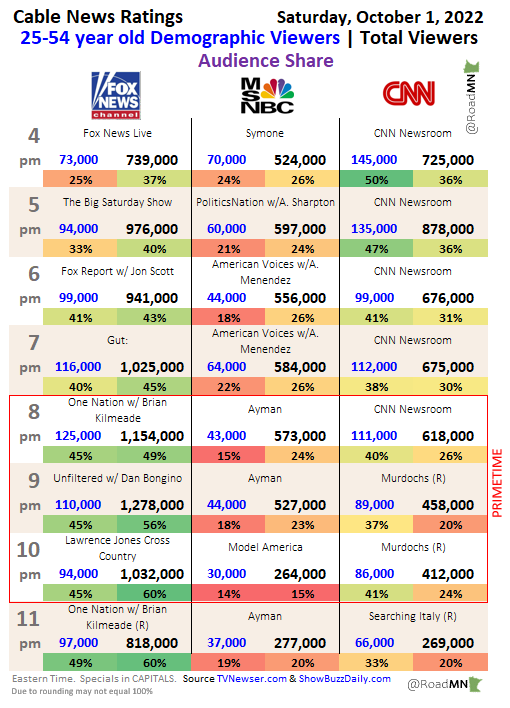 RoadMN 📈 on Twitter "Cable News Ratings Overload Sat Oct 1 FoxNews had more total viewers